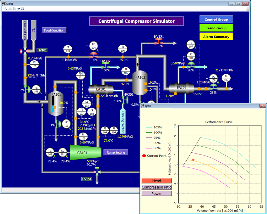 The purpose of this simulator is to learn about chemical engineering principles and the basis of operation of the gas compression process based on a centrifugal compressor and the ancillary equipment used in an ethylene plant.