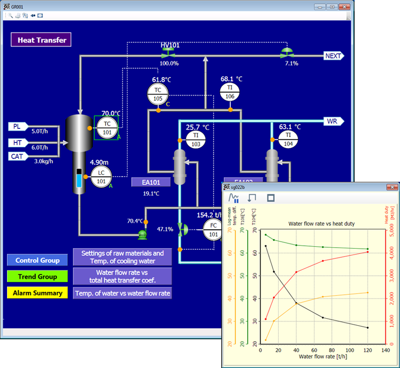The purpose of this simulator is to learn about heat transfer which is a principle and basis of chemical engineering, through a process that removes heat from a polypropylene polymerization reaction by use of two external circulation coolers.