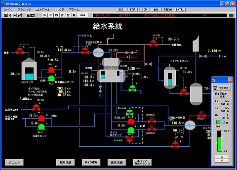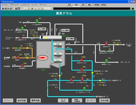 DCS模擬タイプでは、オペレータコンソールの画面をグラフィック機能で模擬します。グラフィック運転画面や制御機器の設定画面、トレンドグラフ画面などが模擬されます。
