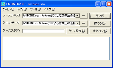 EQUATRAN ウィンドウ上で「ラン」ボタンをクリックすると、 入出力データの出力(O)に計算結果が出力されます。
