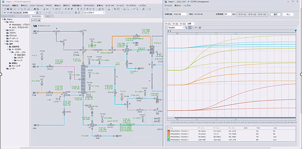 仮想プラント環境で『もし〜だったら?』というシナリオを試せるケーススタディ機能を強化しました。省エネや効率化などの目的で新たな運転条件や操作手順を試したい場合、最大3ケースの試行を同時に実行し、比較検討でき、テストの効率化とコスト削減に寄与します。