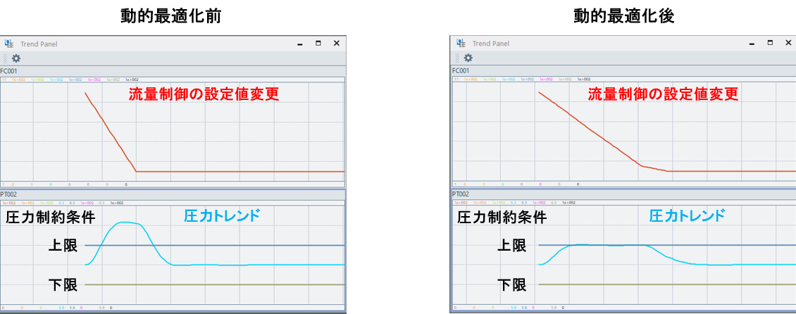 プラントの運転上の管理値や製品スペックなどの条件をふまえて、原料投入やエネルギー使用量等に無駄がない最適な運転条件を探索します。運転条件を変更する際にも、設備にかかる負荷を抑え、安全かつ効率よく移行できるパターンを提示します。一時点だけの最適化(静的最適化)ではなく、負荷変動や外部環境の変化にも柔軟に対応する持続的な最適運転(動的最適化)を実現します。