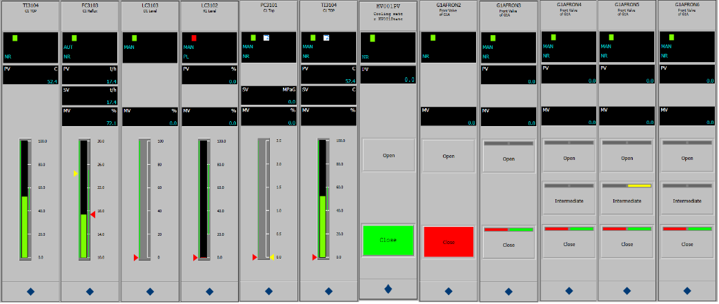 DCSエミュレーションの表示機能として CENTUM VP対応のフェースプレートを用意しました。 これまでの標準の代わりとして登録することにより利用することができます。 従来の標準タイプと同様にPID, PVIなど14種類の計器タイプに対して基本機能を提供しています。 CENTUMの制御機能とVisual Modelerの標準機能の違いにより、CENTUMタイプのフェースプレートの一部機能を活用いただくためには、カスタムユニットをご準備いただく必要があります。